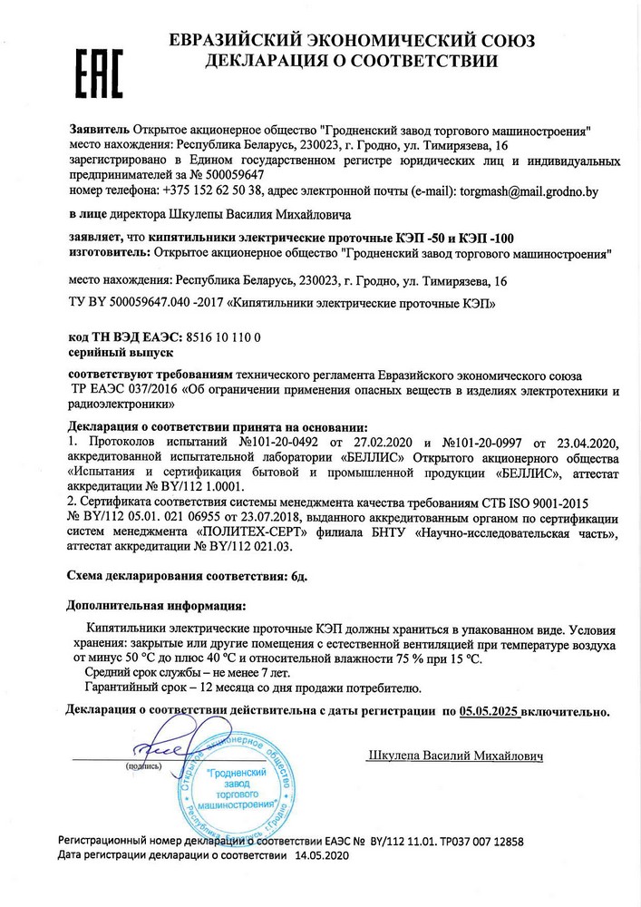 Основные достоинства/отличия кипятильников электрических проточных КЭП производства ОАО "Гродторгмаш"