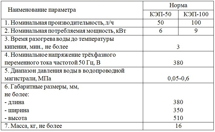 Кипятильники предназначены для непрерывного приготовления кипяченой воды на предприятиях общественного питания и торговли при постоянном подключении к системе холодного водоснабжения. Кипятильники относятся к стационарным приборам, предназначенным для постоянного присоединения к стационарной проводке. Управление работой кипятильника осуществляется электронным блоком управления. Элементы управления вынесены на боковую сторону корпуса для исключения воздействия на них пара. В состав поставки кипятильника входят комплектующие для его подключения (кабель питания, шланг наполнения и шланг слива). Резервуар расположен внутри корпуса, это снижает теплопотери и защищает оператора от прикосновения к горячим поверхностям. Внутри резервуара установлена съёмная переливная труба, которая служит для слива воды при чистке кипятильника и для перелива воды в канализацию. Номинальная производительность 100 л/ч; номинальная потребляемая мощность 9 кВт; Время разогрева воды до температуры кипения - 3 мин.; Номинальное напряжение трёхфазного переменного тока частотой 50 Гц, 380 В.; Диапазон давления воды в водопроводной магистрали 0,05-0,6 МПа. Габаритные размеры: длина 380мм., ширина 350мм., высота 510 мм., масса 16 кг. Изготовитель гарантирует нормальную работу кипятильника при условии соблюдения правил установки, эксплуатации, технического обслуживания и хранения согласно руководству по эксплуатации. Гарантийный срок – 12 месяцев со дня продажи потребителю, но не более 24 месяцев со дня изготовления.